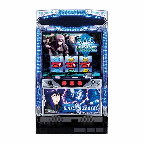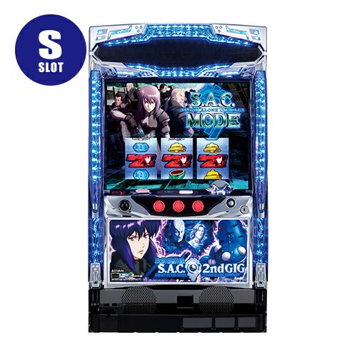 サミーより、好評を博した「パチスロ攻殻機動隊STAND ALONE COMPLEX」の続編として「パチスロ攻殻機動隊S.A.C. 2nd GIG」が登場! 今作は「通常時のチャンスゾーンが強化」「上乗せ特化ゾーンがシステムチェンジ」「新規要素も多数搭載」などの変更点が加わり、前作と比べてゲーム性が大幅にアップしている。基本仕様は、1セット50G+α・1ゲーム約1.4枚純増のART機で、継続システムはゲーム数上乗せ型で、ボーナス込みの純増は約1.8枚。通常時は、「高確率ゾーン」や「電脳MODE」へ突入させ、そこからART「S.A.C.モード」の当選を狙うのが基本パターン。 本機におけるボーナスは3種類存在し、SUPER BIG BONUS(約300枚)は、通常時ならART+α濃厚で、ART中なら「電脳RUSH」獲得濃厚!?BIG BONUS(約200枚)は通常時ならARTとチャンスゾーンを、ART中なら「電脳RUSH」を抽選し、REG BONUS(約40枚)はロングフリーズ発生確率がアップし、キャラ背景に秘密がある!? ART「S.A.C.モード」中は上乗せ特化ゾーンである「電脳RUSH」「電脳HACK」でゲーム数を上乗せし、ロング継続に繋げるゲーム性で、前述の通り、ART中のボーナス当選は上乗せ特化ゾーン獲得の大チャンスとなる。
