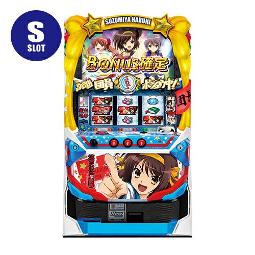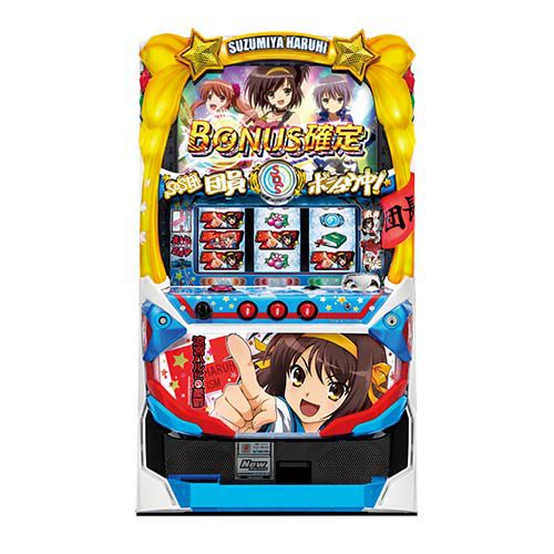 ライトノベルが原作の人気アニメ「涼宮ハルヒの憂鬱」とのタイアップパチスロ。スペックはボーナス+ARTタイプで、1G純増約1.8枚のART「激奏LIVE」が出玉のキーとなる。通常時は2種類のCZ「エピソードステージ(突破期待度約15%)」と「閉鎖空間(突破期待度約45%)」を突破しARTを目指すゲーム性で、ARTは直撃抽選も行っている。 ボーナスはビッグボーナス1種類のみで、ボーナス消化中は通常時はART抽選を、ART中はゲーム数上乗せ、特化ゾーンの抽選をそれぞれ行っている。ART突入時は必ず特化ゾーン「ハレ晴レCHANCE」を経由する。ハレ晴レCHANCEは開始時に基本となる配当ゲーム数が決定され、消化中に毎ゲーム倍率に応じて上乗せするゲーム数が増加する仕組みだ。 引き次第では強烈なゲーム数が上乗せされるため、非常に夢がある台だ。ART中のリプレイ10回連続成立で「激奏ミッション」の突入が確定し、ミッション成功でゲーム数が上乗せされる。さらにゲーム数上乗せ後に「ハレ晴レCHANCE」や「上乗せCOMBO」を抽選が行われる。本機は残りゲーム数を2倍にするダブルアップチャレンジや3桁上乗せ濃厚の「SOSレスキュー」など、5号機屈指の一撃性を秘めた特化ゾーンを搭載している。